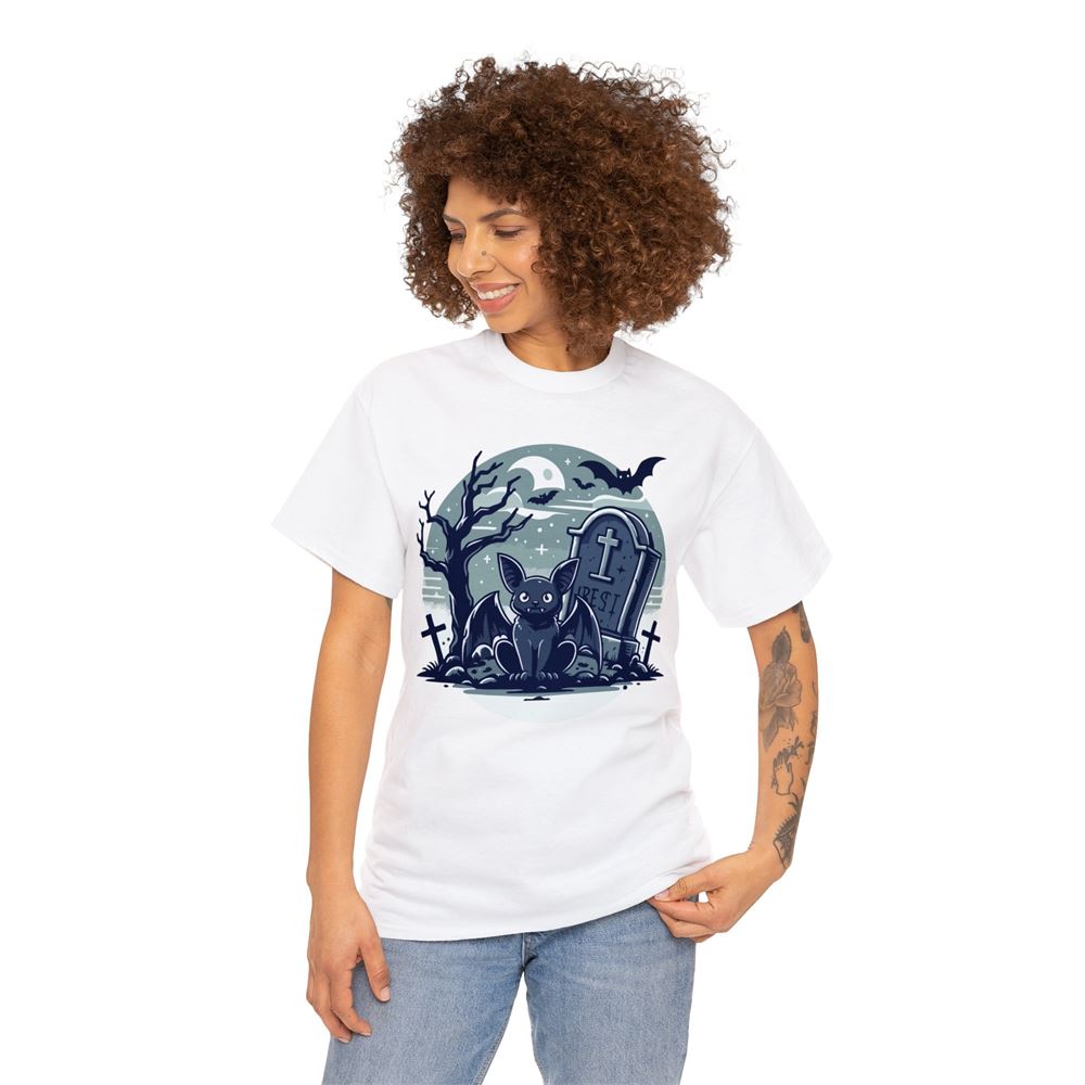 Under the Moonlight with a Bat Sitting on Tombstone Unisex Heavy Cotton T-Shirt Large